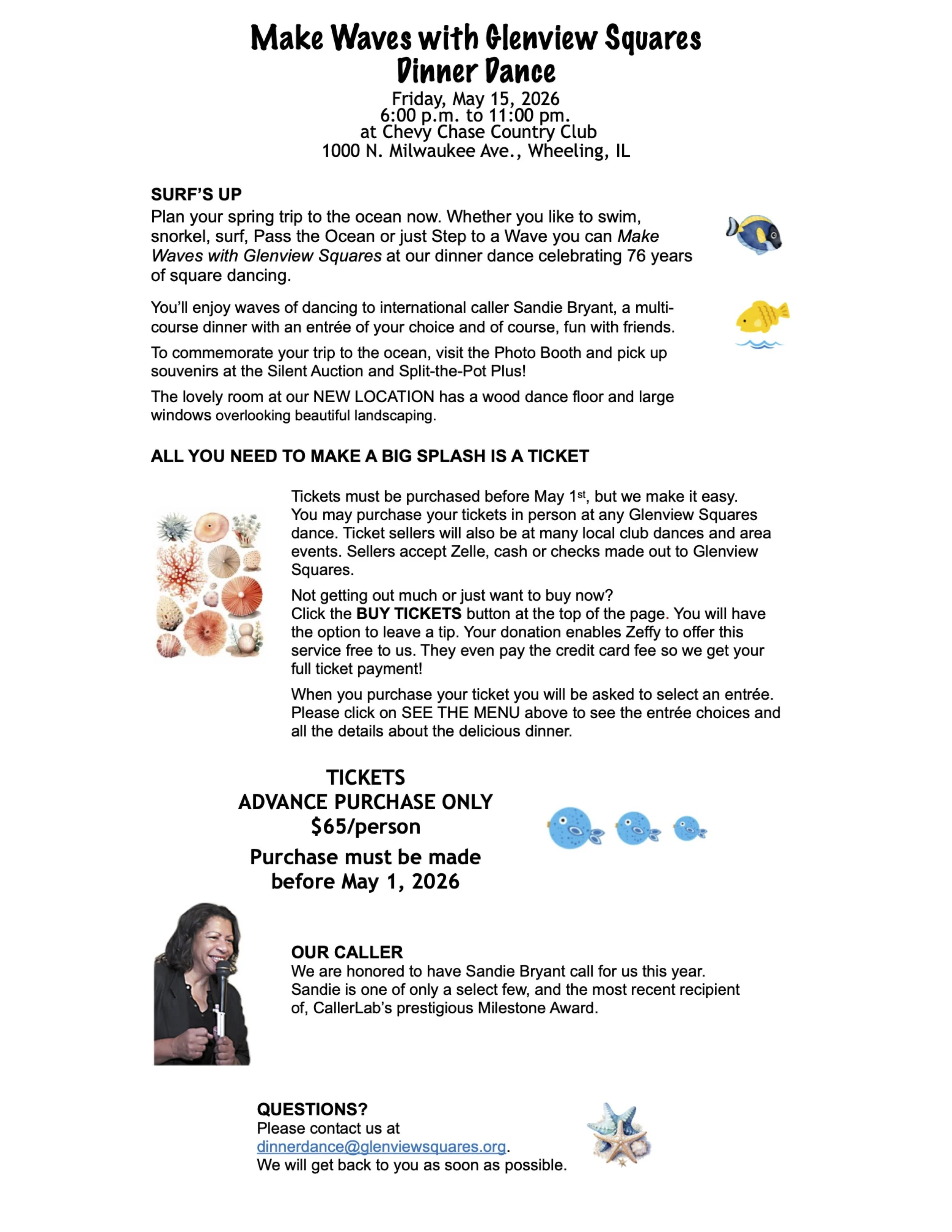 Glenview Squares is a Square Dance Club located in Glenview, Illinois. We are a member of the MCASD (Metropolitan Chicago Association of Square Dancers). Our members come from all around the northern Chicagoland area, and we welcome all Square and Round dancers. We dance at the Plus level. The Glenview Square Dance Club was organized in 1950.