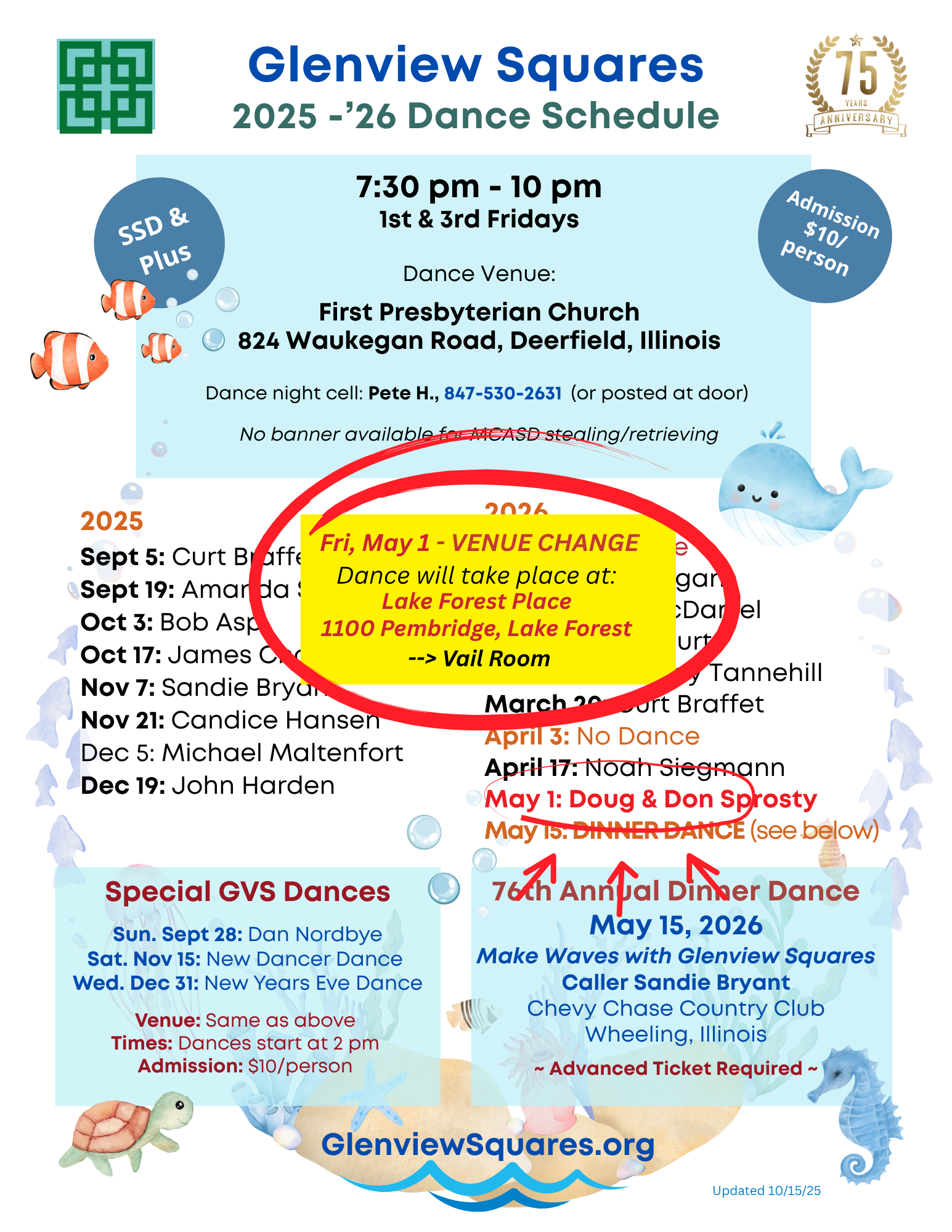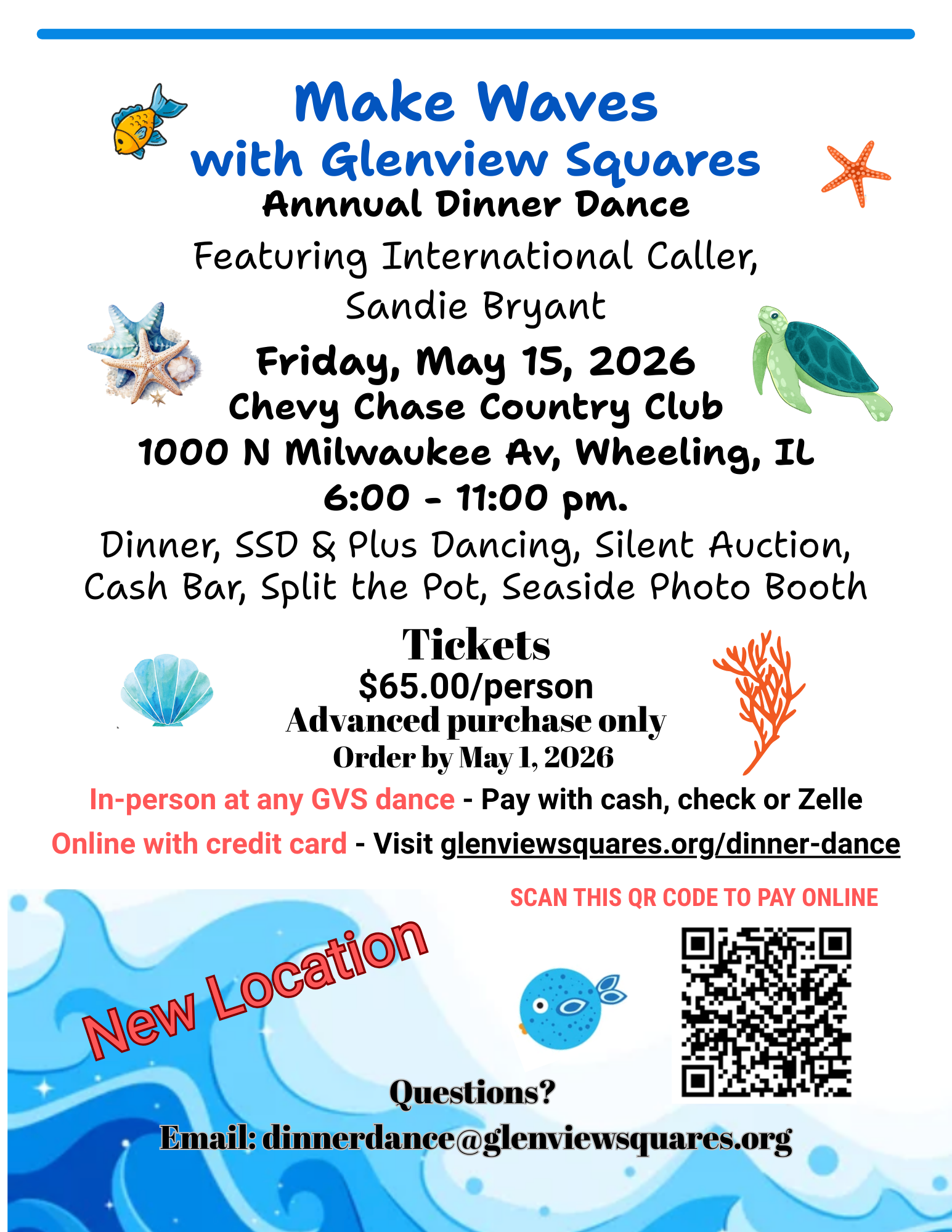 Get ready to make a few waves at Glenview Squares annual Dinner Dance, taking place Friday, May 15 at a beautiful new venue, the Chevy Chase Country Club, in Wheeling, Illinois, featuring caller Sandie Bryant. Purchase your early bird ticket by Dec. 31, 2025 at Glenview Squares club dances or online. Click HERE for full details