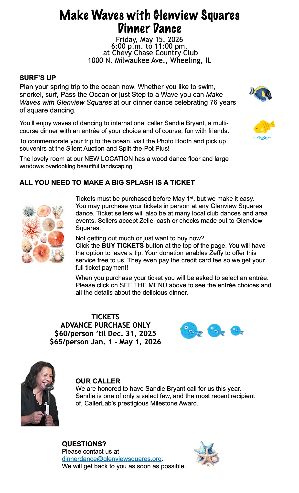 Glenview Squares is a Square Dance Club located in Glenview, Illinois. We are a member of the MCASD (Metropolitan Chicago Association of Square Dancers). Our members come from all around the northern Chicagoland area, and we welcome all Square and Round dancers. We dance at the Plus level. The Glenview Square Dance Club was organized in 1950.
